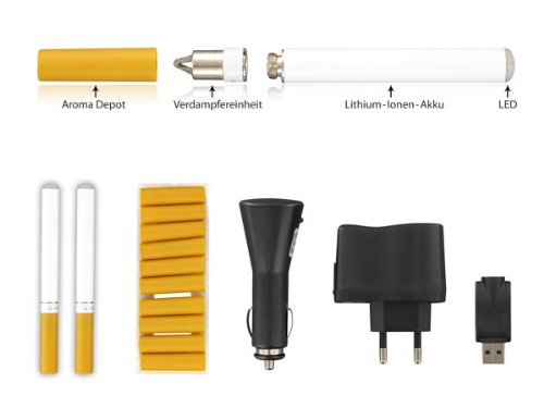 Die E-Zigarette imitiert sogar die Glut, da eine kleine rote Leuchtdiode die Spitze der Zigarette, je nach stärke des Zuges, beleuchtet.Die elektrische Zigarette funktioniert ohne Verbrennung, Sie stellt Wasserdampf (Aerosol) mit Aroma her und die Nikotinbelastung entfällt. Dieses Verfahren wurde in Japan patentiert und findet seitdem enormen Zuspruch. Das Hauptelement einer elektrischen Zigarette ist der sogenannte Vaporisator (Verdampfer). Ein Mikrochip reagiert auf den Luftstrom der beim ziehen entsteht und schaltet somit den Vaporisator ein, der die Flüssigkeit im Depot erwärmt und gleichzeitig verdampft...