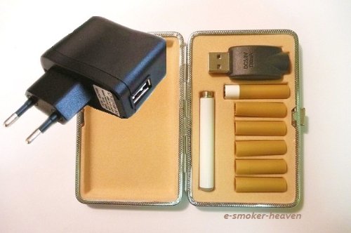 E-Zigarette Starterset mit edlem Zigaretten Etui aus Metall + 5 Tobacco Depots, Wandladeadapter, USB-Ladegerät Feature