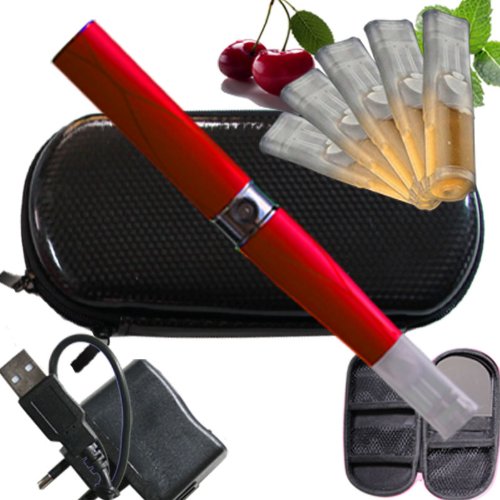 Eine komplette elektronische Zigarette LiqC Ego-T Farbe Weinrot Etui Racing schwarz mit Schminckspiegel, Travelcharger, USB 5 Depots mit e-Liquid ohne Nikotin, Nikotinfrei Aroma Kaffee