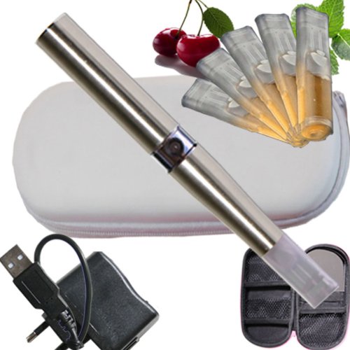Eine komplette elektronische Zigarette LiqC Ego-T Aroma Virginia Tabak Farbe Stahl 5 Depots mit e-Liquid ohne Nikotin, Nikotinfrei Etui Weiss mit Schminckspiegel, Travelcharger, USB
