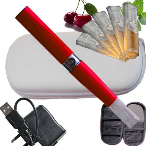 Etui Weiss mit Schminckspiegel, Travelcharger, USB 5 Depots mit e-Liquid ohne Nikotin, Nikotinfrei Aroma Vanille Farbe Weinrot Eine komplette elektronische Zigarette LiqC Ego-T