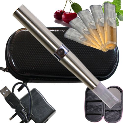 Eine komplette elektronische Zigarette LiqC Ego-T Farbe Stahl 5 Depots mit e-Liquid ohne Nikotin, Nikotinfrei Etui Racing schwarz mit Schminckspiegel, Travelcharger, USB Aroma Mint / Menthol